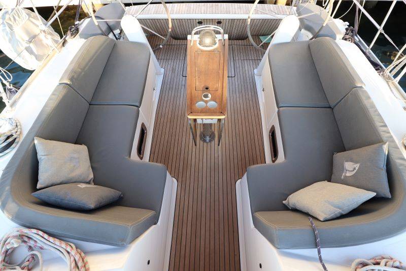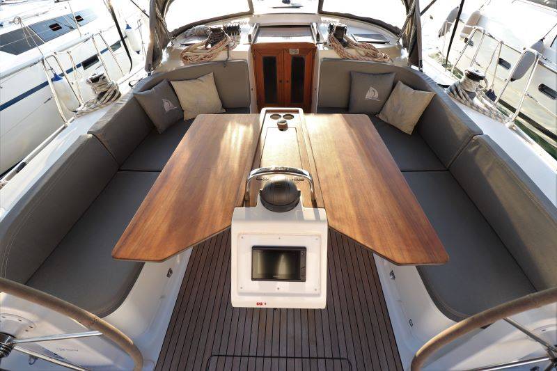 A cruise sailing boat with dual steering wheel to improve comfort in navigation, with genoa winch near the helmsman, with tools support on the cockpit table and on the console of the helm station, everything is designed to make the maneuvers extremely simple.