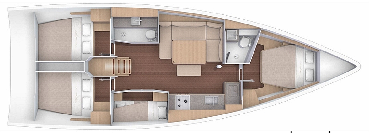 Beautiful lines, plenty of space, intense light, comfort and an all-round performance, the Dofour 430 combines the best of all these characteristics. Its 4 double cabins with 2 bathrooms, can accommodate 8 persons.